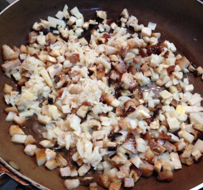 ・粗みじんにしたたけのこ・しいたけ・焼豚と、貝柱を強火で炒めます。