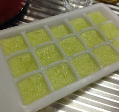 ・メロン果汁を製氷皿に注いで、冷蔵庫で冷やし固めます。
