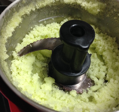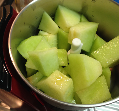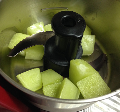 ・前回、かき氷部分は普通の水で作りましたが、今回はメロンをフードプロセッサーにかけて果汁丸ごと使ってみようと思います。