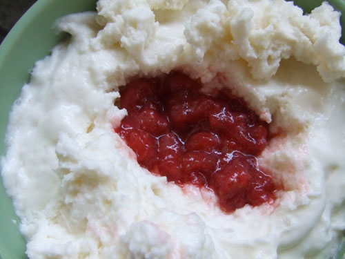 真ん中をスプーンですくって穴をあけ、煮詰めた苺の実を中に投入。