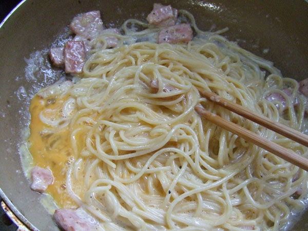 ・ソースがスパゲティによく絡んだら火を止めて、溶き卵を回し入れて混ぜます。