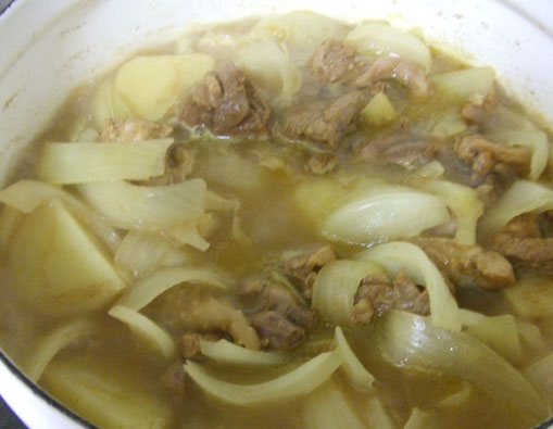 ・肉の表面の色が変わったら玉ねぎ・じゃがいもを投入して炒めます。