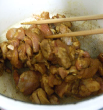 ・軍鶏肉を一口大に切って、塩とカレーパウダーをもみこんでおきます。