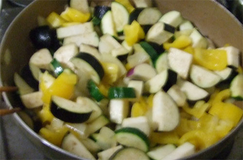 ・フライパンにオリーブオイルをひき、玉ねぎ→ズッキーニ→パプリカ→なす の順に炒めます。
