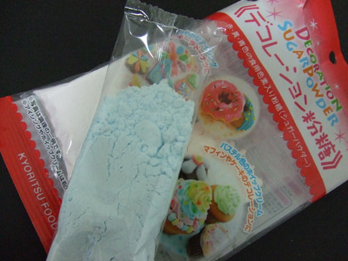 粉砂糖に食用色素(赤・黄・青)が入っていて、食材に混ぜると着色できるというもの。