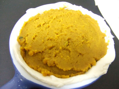 耐熱皿にパイ生地を敷いて、残りのカボチャフィリングをたっぷり詰め込みます。