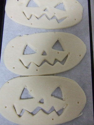 ・パイ生地にカボチャフィリングをのせ、表情をつけた方の生地を上からかぶせます。