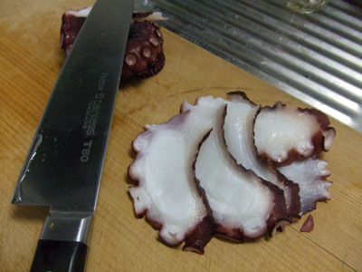 タコはスーパーでお刺身が売ってなかったので、自分で切ることにしました。