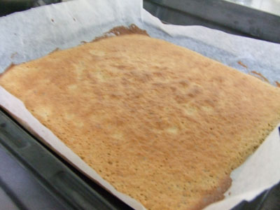 オーブンシートを敷いた天板に流し入れて、190℃のオーブンで8分焼きます。