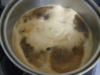 しばらく見守ると瞬間的にぶわっと泡が立ちアルコールが飛ぶので、そのへんで火を止めます。
