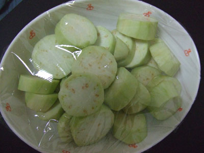 ・ナスの皮をむいて輪切りにし、ラップをかけて電子レンジで加熱します。