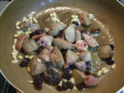 ・バターをフライパンで熱し、一口大に切ったレバー、松の実、レーズンを入れて炒めます。