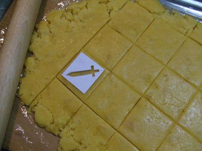 ・休ませた生地を麺棒でのばし、3.5cm角に切り出します。