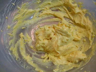 ・バター、砂糖、卵黄を泡立て器ですり混ぜ、小麦粉を再度ふるいながら加えます。